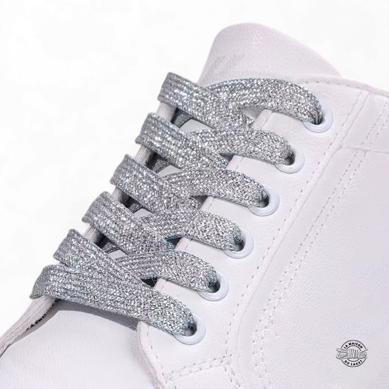1 paire de lacets paillettes (2 lacets) pour sneakers et baskets. Couleur argenté. Lacet plat de qualité.